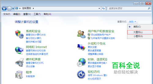 1、首先可以按序点击“开始-控制面板”,进入“控制面板”中,查看方式选择“大图标”。