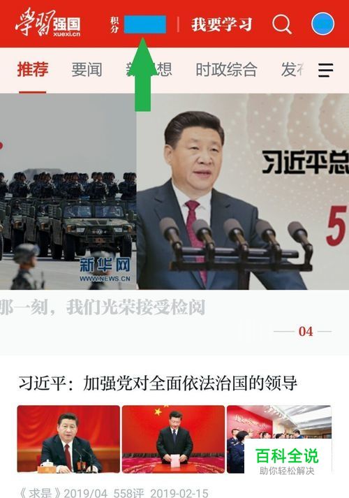 第一步:在学习强国APP主界面,点击积分处。