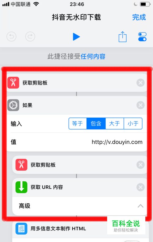 搜索”获取剪贴板“,点击选择。 再搜索”如果“,点击选择”如果“,”输入“一栏不做修改,在”值“一栏输入”http://v.douyin.com"。 再搜索“获取剪贴板”,点击选择“获取剪贴板”。 再搜索”网页“,点击选择”获取URL内容“。