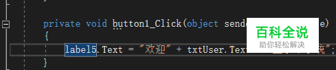 双击【登录】按钮,生成Click事件,在事件中输入如下代码: label5.Text = "欢迎" + txtUser.Text + "登录本系统"; 其中,label5是基本信息显示下方的label,“+”起到了连接两个字符串的作用