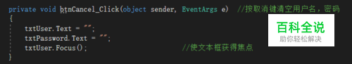 双击【取消】按钮,生成Click事件,在事件中输入如下代码: txtUser.Text = ""; txtPassword.Text = ""; txtUser.Focus(); 用于将两个文本框内容设置为空,按下取消键会清空用户名和密码