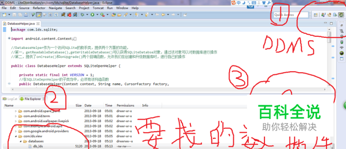 选择DDMS 切换到DDMS,显示File Explorer窗口,找到/data/data/ 啰嗦一句,你可能在你自己的eclipse没找到,File Explorer ,如果找不到的话,就去网上下载,"easyExplorer",放在eclipse的plugins目录下:就OK了,重启一下。