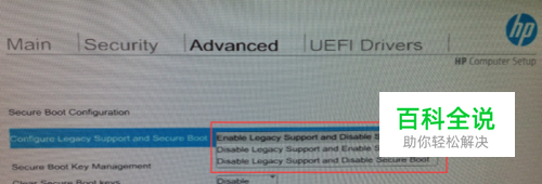 进入选项后如下图有三种可选方式. 分别为: Enable Legacy Support and Disable Secure Boot Disable Legacy Support and Enable Secure Boot Disable Legacy Support and Disable Secure Boot