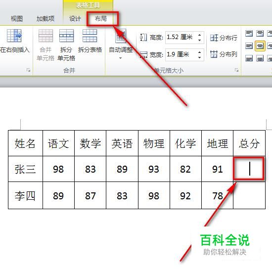 将光标定位在总分中的一个单元格,然后找到“布局”菜单。