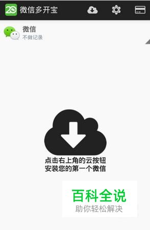 手机里安装过微信的用户,需下载微信多开宝,成功安装以后就可以同时登陆无数个微信账号哦!打开微信多开宝,点击右上角的云按钮,安装您的第一个微信。