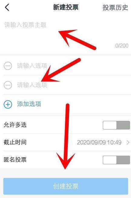 在投票功能页面中,输入投票主题以及选项,之后发起投票即可