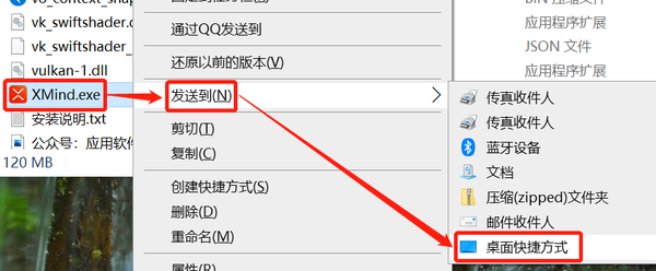 2、打开刚刚复制过去的“XMind 2021”文件夹,右键“XMind.exe”文件,选择“发送到”,点击“桌面快捷方式”。