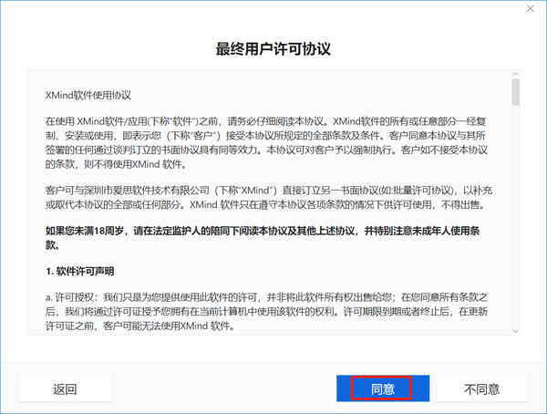 3、打开桌面上的XMind快捷方式,弹出的界面点击“继续”,并同意许可。