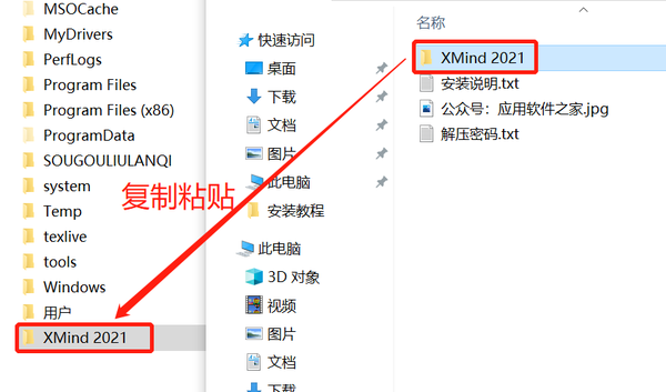 1、下载到英文路径并解压完成后,将“XMind 2021”文件夹复制粘贴到需要安装的磁盘或文件夹内(例如,小编将该文件夹复制粘贴到C盘根目录下,不建议按照小编的方式来,因为小编的电脑只有一个盘,建议将其复制粘贴到D/E/F等其他盘内)。