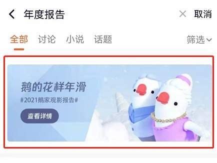 1、点击上方搜索框输入“年度报告”或“2021鹅家观影报告”或“2021我的花样年滑”等关键字词。