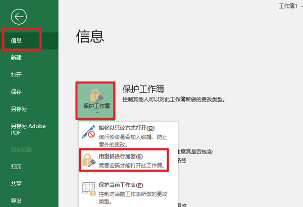 2、信息→保护工作簿→使用密码进行加密(E):↓