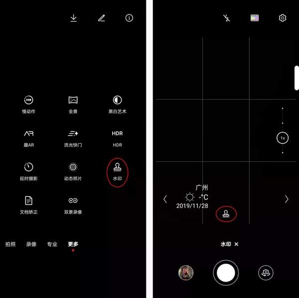 设置方法也很简单,以华为Mate30 Pro为例,在拍照界面点击更多之后,进入水印模式,点击印章这里可以获得更多水印的选择项目。