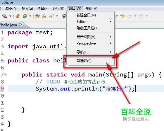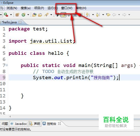 打开eclipse,然后找到eclipse界面菜单栏中的“窗口”菜单,然后用鼠标点击这个菜单。