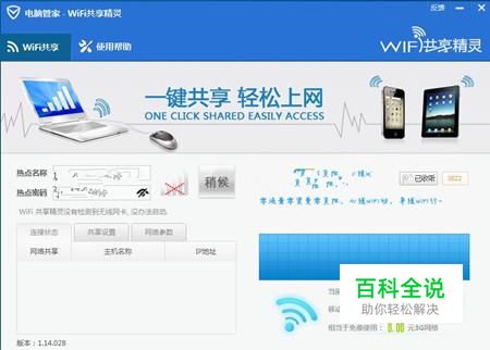 之后我们进入腾讯电脑管家wifi共享精灵的界面,我们在如图红色方块的地方,热点名称和热点密码,如图所示。