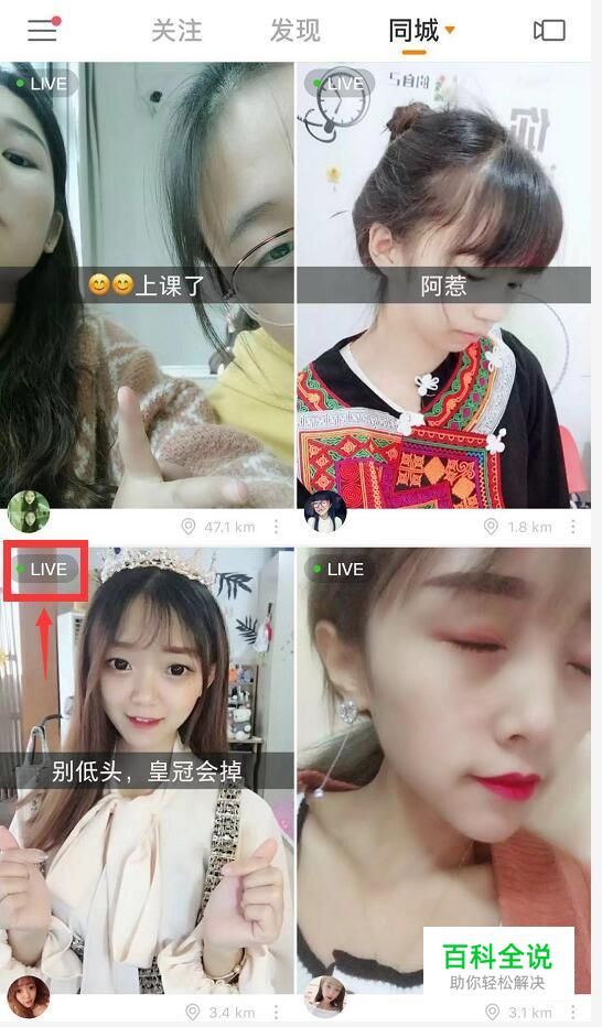 登录之后界面上方就会出现关注、发现、同城的频道选择。这时候按照喜好选择一个频道进入,然后在视频列表页面里找到有“live”标识的就是直播了,点击“live”标识就可以进入直播间,观看直播了。