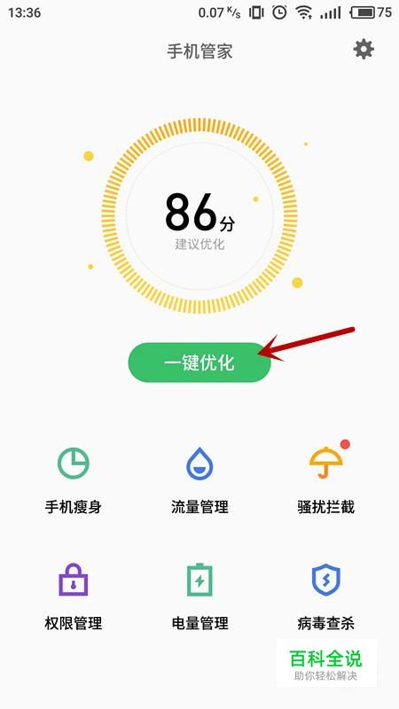 在手机管家界面,选择“一键优化”可以对系统内存进行自动清理。