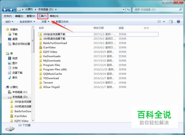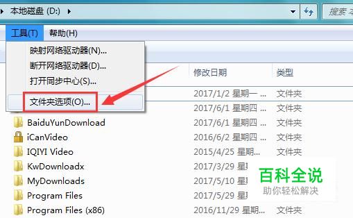 点击工具选项在其下拉列表里找到文件夹选项,如图所示: