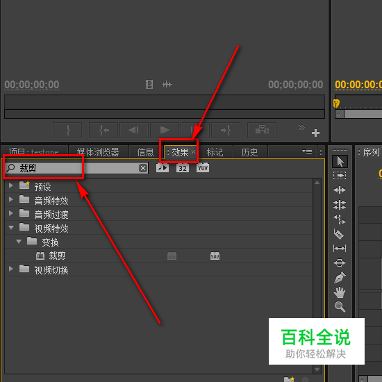 然后在“效果”面板的搜索框里面输入“裁剪”,然后按下回车。