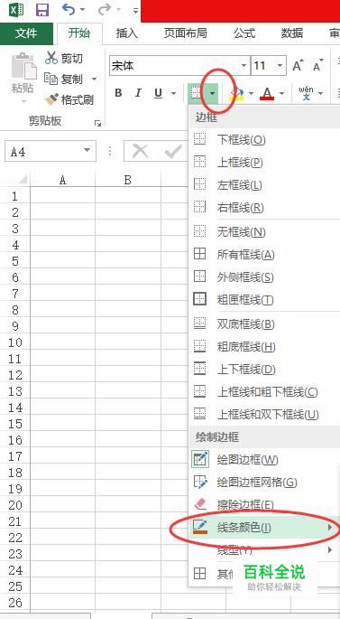 我们打开excel之后,在开始工具栏找到图中所示的图标,点击旁边的小三角形,从中选择“线条颜色”。