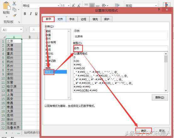 操作步骤:选择区域 -【开始】-【设置单元格】-【数字】-【自定义】-【类型】输入:“@市”-【确定】