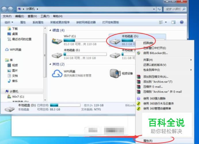 属性 然后右击D盘,在下拉菜单中选择【属性】,如下图所示: