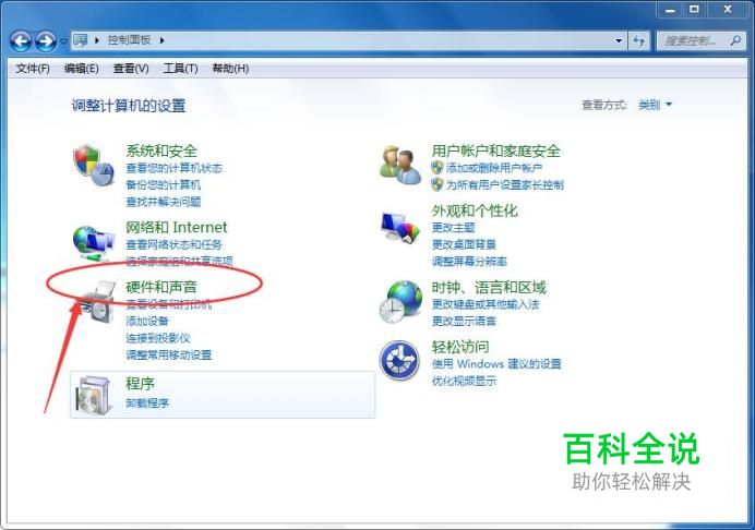 硬件和声音 然后点击【硬件和声音】,如下图所示: