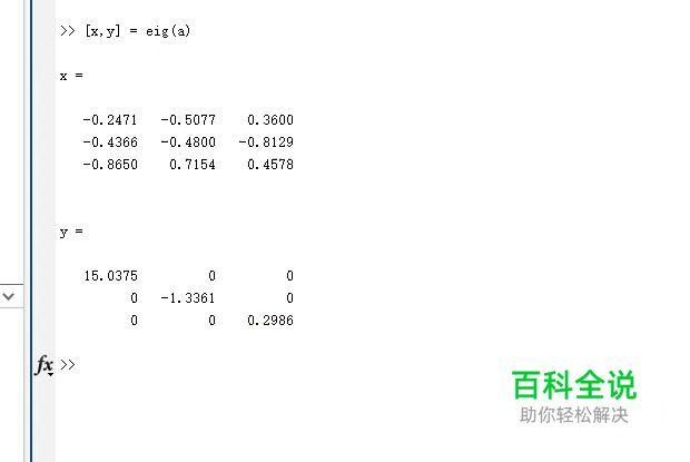 然后执行[x,y] = eig(a)公式,求出x,y的值,如下图所示