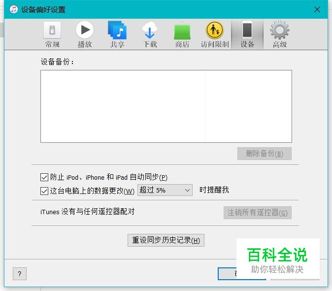 在弹出的“偏好设置”对话框中,切换到“设备”,就能看到备份数据了,这时,“删除备份”。按钮还是灰色的。