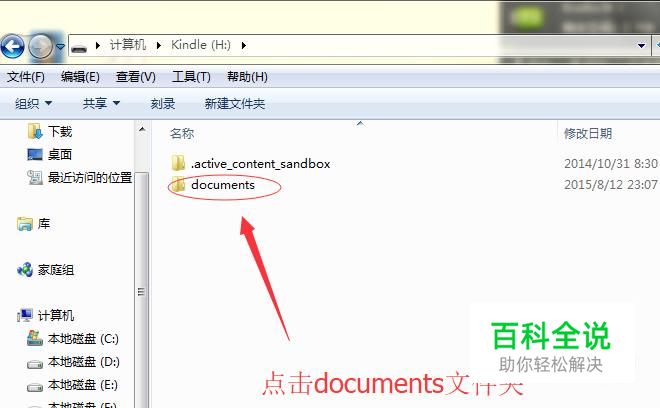 进入kindle的文件夹以后,我们点击打开documents文件夹,如下图所示