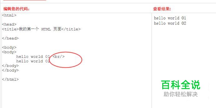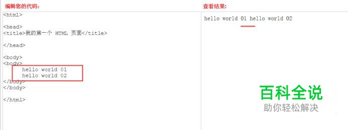 输入CSS内容 然后再输入CSS内容,即可看到行间距变化,如下图所示: 总代码 <style type="text/css"> body{font-size:12pt;line-height:3} </style> </head> <body> <body> hello world 01 <br/> hello world 02 </body>