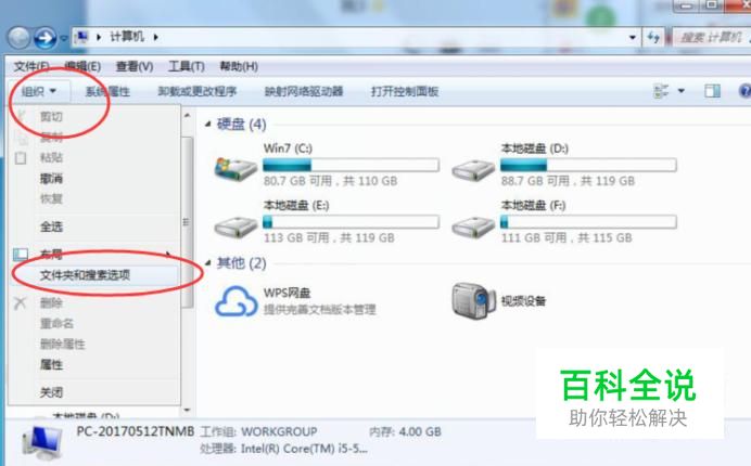 文件夹和搜索选项 然后点击【组织】,在弹出的下拉菜单中选择【文件夹和搜索选项】,如下图所示: