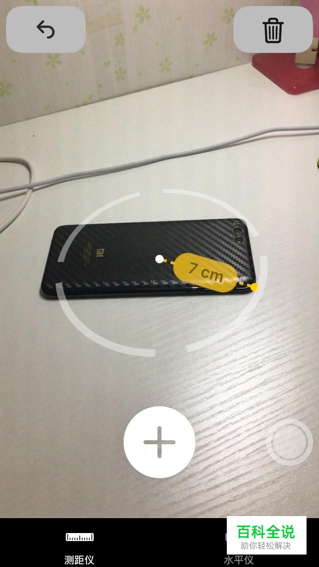 让屏幕中心的白点对齐平面的一端,并点击白色加号,添加起点,移动手机,屏幕中心和起点之间就会形成一条虚线,上面的数值就是距离。