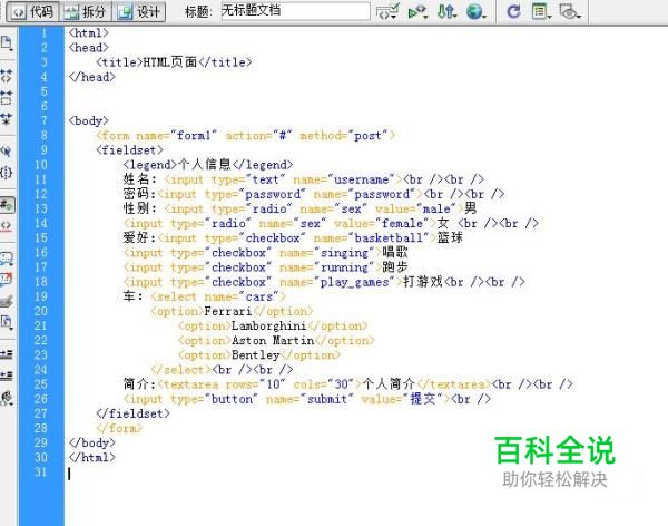 常用表单基础标签 <form></form>定义表单 <input>定义输入控件 <textarea></textarea>定义多行文本输入 <button>定义按钮 <select>定义选择的下拉列表 <optgroup>定义选择列表中的选项组合 <option>定义选择列表的选项 <label>定义input的标注 <fieldset>定义围绕表单的边框 <legend>定义fieldset的标题