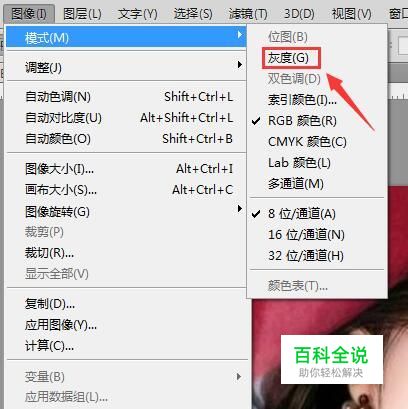 使用ps将我们的图片打开,然后在图像里找到模式选项,点击该选项在其子级菜单哪里找到灰度选项,如图所示: