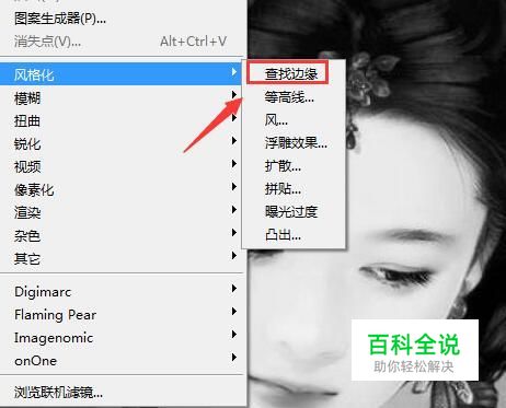 点击灰度选项在弹出的对话框里选择扔掉,然后再在滤镜菜单里找到风格化选项,点击该选项在其子级菜单哪里找到查找边缘选项,如图所示: