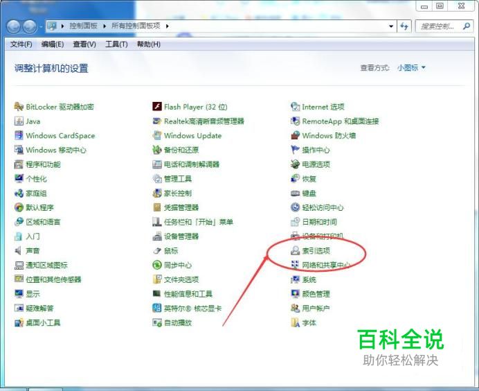 索引选项 打开【控制面板】,然后找到【索引选项】,如下图所示: