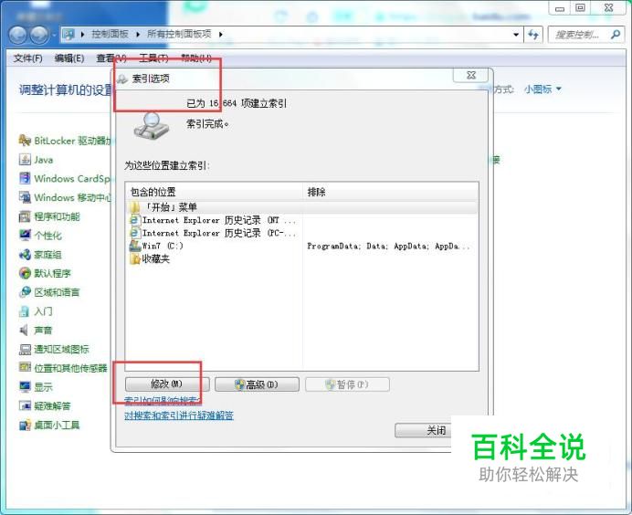 修改 然后在【索引选项】窗口中,点击【修改】按钮,如下图所示: