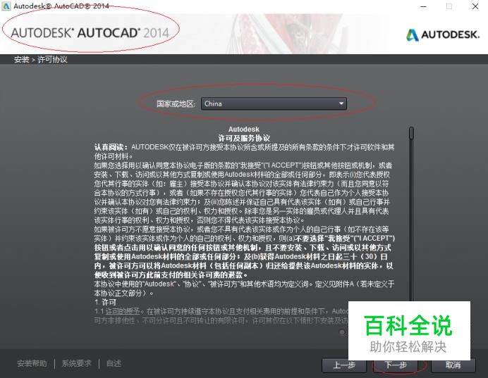 如图所示,选择国家或地区。勾选"接受Autodesk许可及服务协议"单选框,设置完成点击"下一步"按钮。