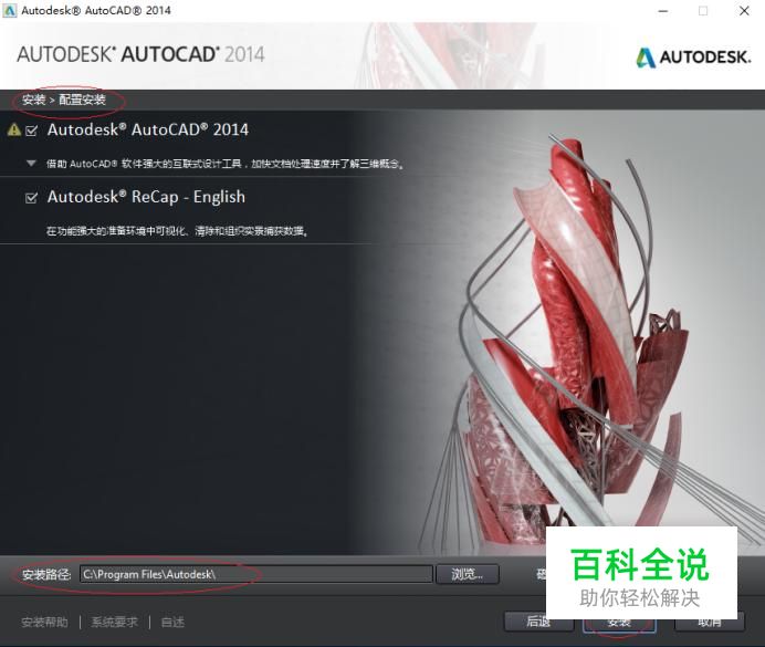 如图所示,点击"安装路径→浏览..."按钮。选择AutoCAD 2014安装路径,设置完成点击"安装"按钮。