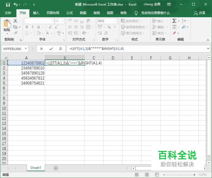 我们在B1单元格输入公式【=LEFT(A1,3)&"****"&RIGHT(A1,4)】