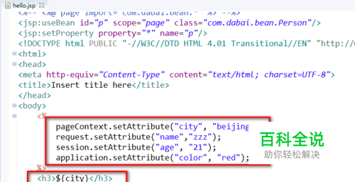 当然我们也可以指定一个要输出的属性范围,我们使用${pageScope.属性}、${requestScope.属性}、${sessionScope.属性}、${applicationScope.属性}来指定需要输出的属性范围,如下图所示。