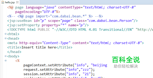最后我们自定义一个类,使用EL表达式来获取该类中的属性。我们创建一个类的对象并赋值,使用${对象名.属性名}的方法来获取属性值,代码如下图所示。