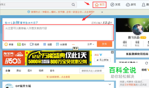 接着在“首页”的最上方,可以看一个方框,在这个方框中输入你想要发表的文字内容