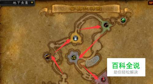 进入安其拉神殿下层之后,按照如下路线逐个消灭除了软泥之外的所有boss。