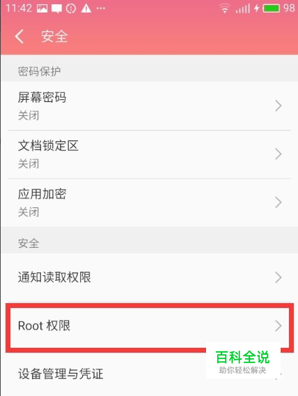 从“安全”界面中,可以看到“ROOT权限”项,如图所示,在此直接点击“ROOT权限”项进入。
