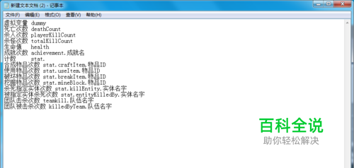 jump 跳跃次数 junkFished 钓鱼钓到垃圾的次数 leaveGame 退出游戏次数没有什么实际用处 minecartOneCm 坐矿车每一厘米 mobKills 被实体杀死次数 pigOneCm 骑猪每一厘米 playerKills 玩家击杀 playOneMinute 游戏时间 以毫秒为单位可以制作在线奖励 sprintOneCm 冲刺每一厘米 貌似只有1.8+才可以用 swimOneCm 游每一厘米 timeSinceDeath 死亡时间?不知道什么意思 treasureFished 钓鱼钓到好东西的次数 walkOneCm 走每一厘米