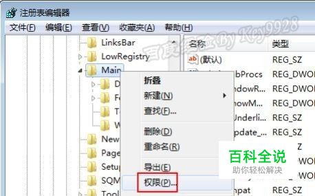 依次展开到HKEY_CURRENT_USER\Software\Microsoft\Internet Explorer\下,右击下面的“Main”项,并选择“权限”: