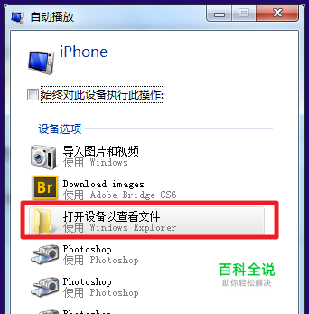 首先,将iPhone6s连接电脑,电脑上会弹出如下的窗口,点击【打开设备以查看文件】