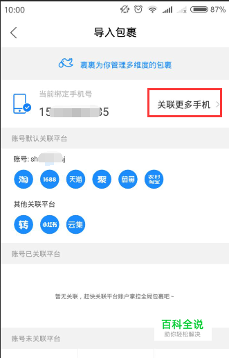在导入包裹的页面中,可以看到当时是否绑定了手机号,帐号默认关联的平台信息,如果您还没有绑定手机号或您有多个手机号,则需要点击关联手机号进行手机号导入包裹
