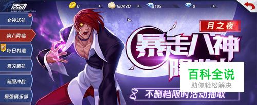 注意活动的时间限制: 活动是游戏刚刚上线,是有时间限制的,可以说是非常珍贵的限时活动,大家如果喜欢八神,或者有收集的癖好的,就不要错过这样一个活动了。